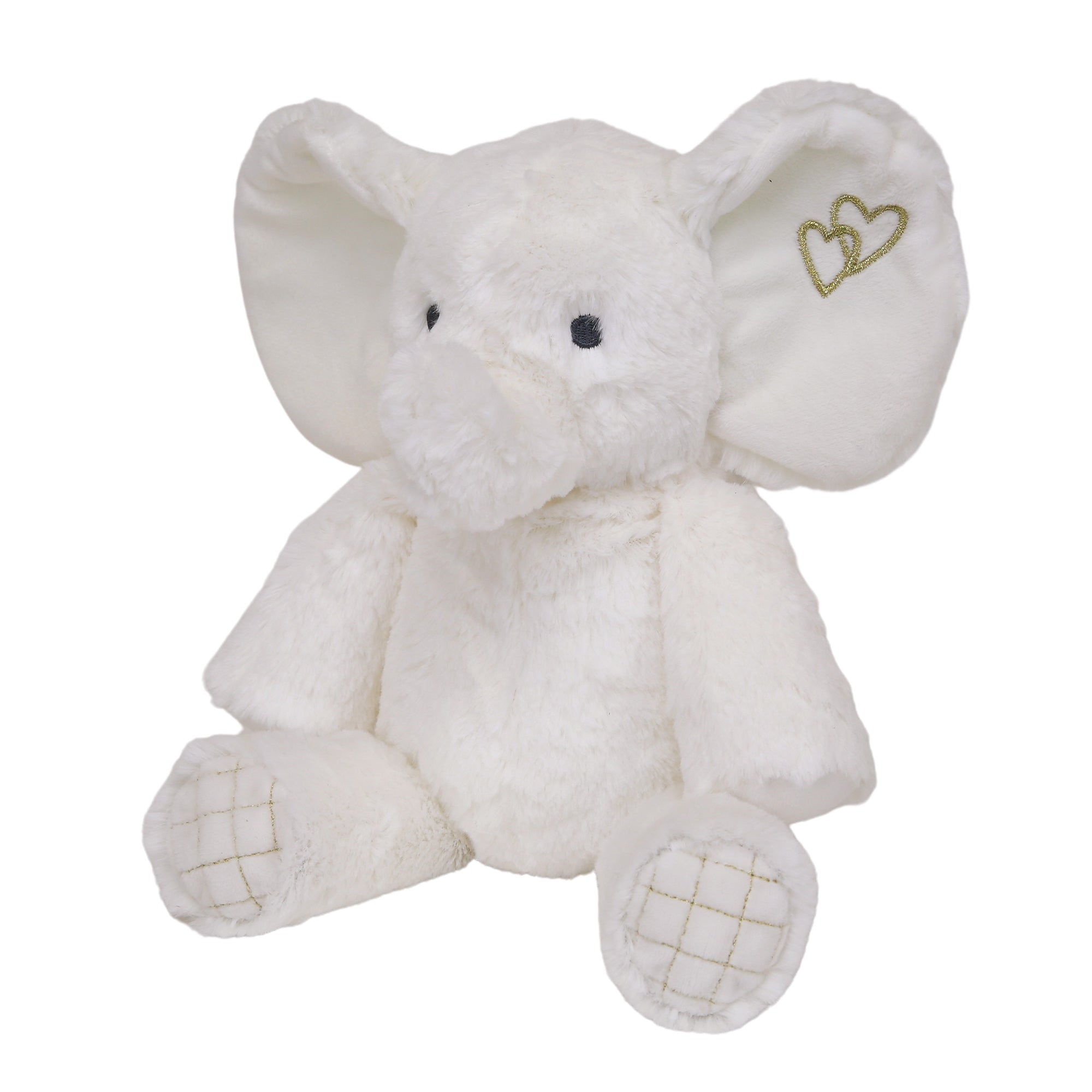 Marshmallow. the friendliest elephant is oh so soft and measures 12.5 in total length. She is made in a minky faux fur. has gold silhouette hearts embroidered on her ear and her back paws have beautiful gold embroidery. She is sure to be baby’s favorite. SKU: 712043E. UPC: 084122712430.